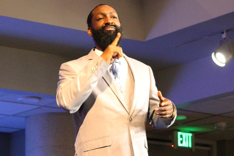 Antoine Hunter, founder of Urban Jazz Dance Company signs on stage before the dance company performs in the gala program.