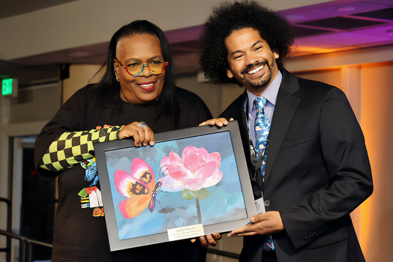 Keris Jän Myrick, DRC Board Chair with Mychal Threets who received the 2026 National Leadership Award.