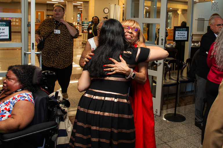 Former DRC Board Member Sandra Smith hugs a gala attendee inside the Tsakopoulos Library Galleria.