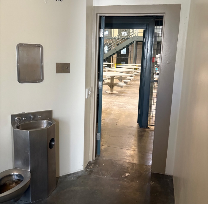 People reported to DRC that California City was unprepared for them upon first arrival, such that they were forced to sleep on the floor of a cafeteria without any mattress or pad. After sleeping on the floor, staff reportedly took people to units that were unsuitable and dirty. According to our interviewees, the units initially did not have working sinks or toilets.18 Several individuals also reported significant flooding in the housing units due to a rainstorm, with water pouring from the walls and filling the units. People also reported that just days prior to DRC’s visit, California City began offering detained individuals jobs to clean the housing units. The work program at California City pays detained individuals just two dollars per day.